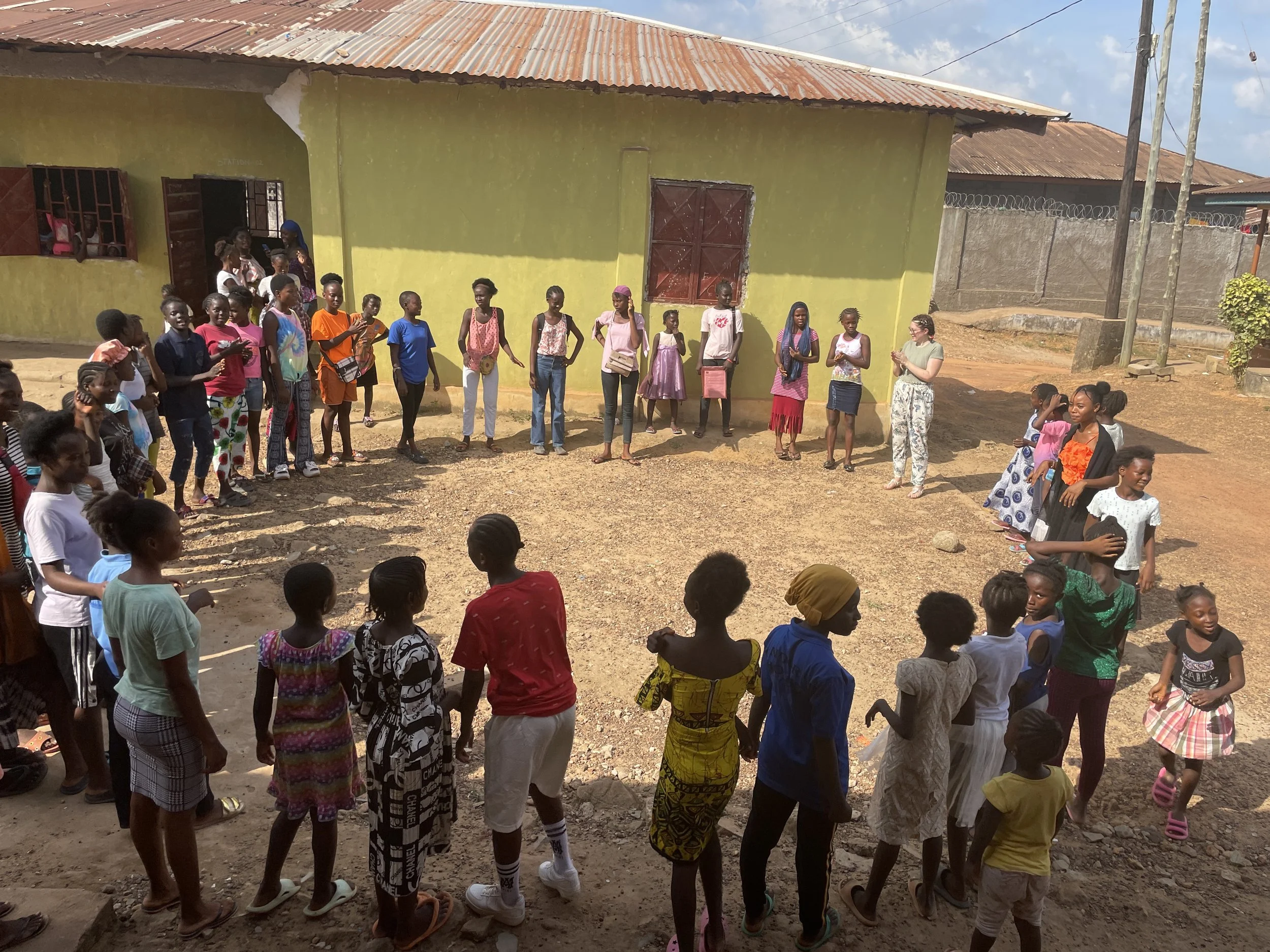 Group of children and a few adults standing in a circle on a dirt ground outside a yellow building with a rusty roof, some children standing in a line in front of the circle.
